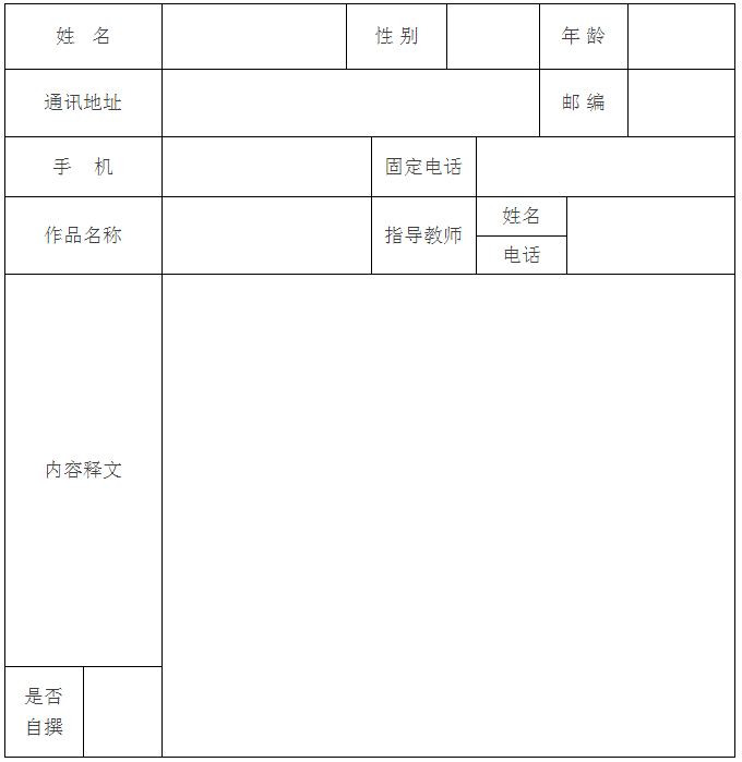 五、征稿要求:本次网络展只收硬笔书法作品,书写工具、书体、形式不限,内容健康向上,提倡自撰诗文(草、篆须附释文),提倡使用16开或A4纸(便于网络展评)。每人限投1件作品,并附报名表一份。集体组稿单位另附参展作者名单一份。初评作品采用电子版格式,复评作品需纸质原件。