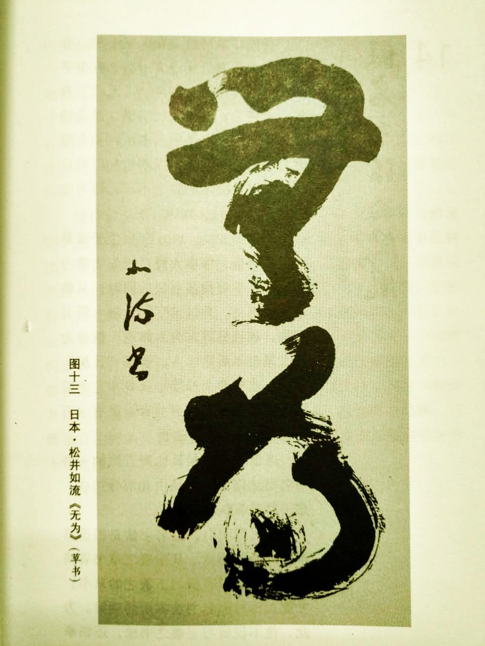 《无为》是松井如流创作的一件现代少字数作品。他这件少字数作品,虽然受到手岛右卿、上田桑鸠的影响,但风神趣味截然不同,它不追求形式的新异、构图的别致、手法的夸张、寓意的巧妙,只是作为擘窠大字来创作,很实在又很平常,而以内在的功力示人,不以外在的形式悦众。