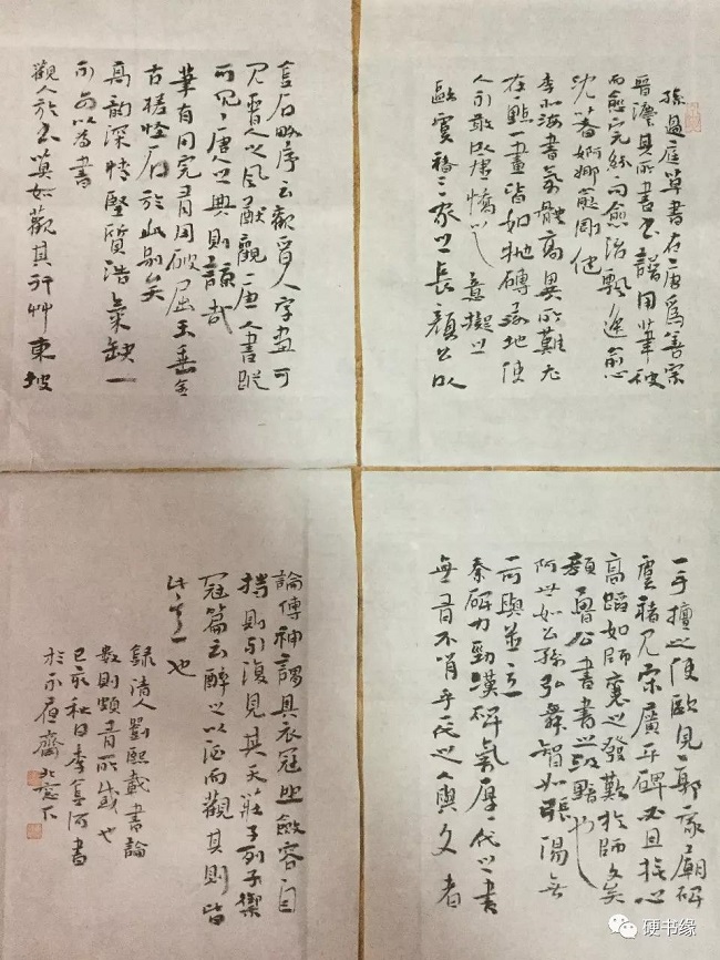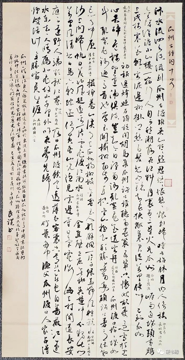 可能受时风影响,有些作者喜欢在作品的形式上进行装饰,诸如双色拼接、文中划线、句下加圈、印花乱钤等,都是常见之手法,用以来吸引眼球。适当地装饰,未尝不可,但应合理有度,切不可割断行气,分裂画面,颠倒次序,破坏章法,否则得不偿失。事实上,拼色、划线、加圈、多印等种种装饰,都是工艺制作,并非艺术创作。哗众取宠,喧宾夺主。有意义也不大,不可不慎。