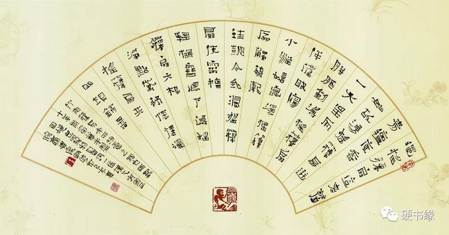 侯明浩的二爨体扇面,字在隶楷之间,功夫极深,妙在古拙而不粗俗,率真而不随便,难在刀刻味中透出书卷气;