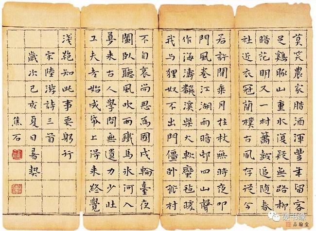 焦石的楷书册页,初看不怎样,细看似嚼檀香橄榄,回味无穷,那楷中带行、半工半放,笔致既佳,意态又妙;