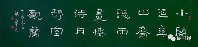 梁国平的粉笔字隶书板书,独一无二,“小阁延爽,山斋听雨,画楼待月,静室观兰”,字字端丽,笔笔遒劲,不仅形式好,而且书法美,不觉眼睛一亮。